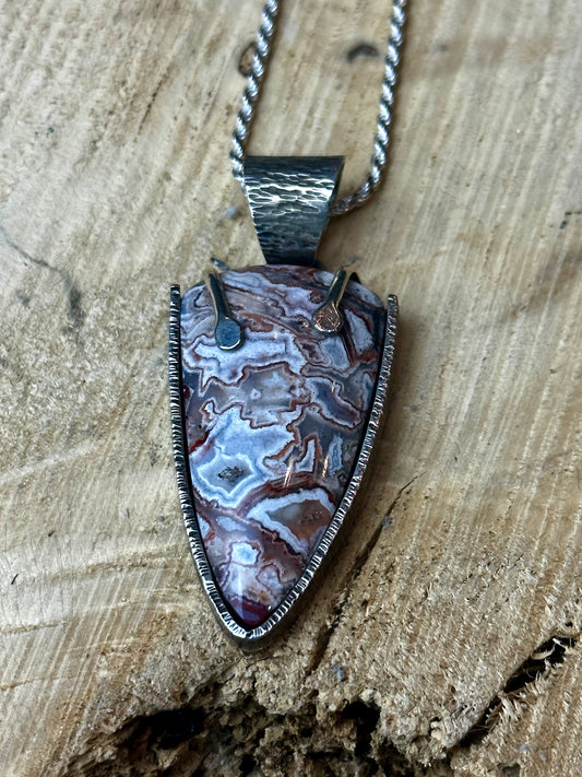 Craze Lace Agate Partial Bezel with Prongs Pendant with Rope Chain
